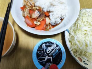 そしてほかはキャベツと味噌汁、オイコスといった超低カロリー物で挟みました。