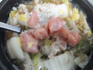 鰹節のうまみがお湯に混ざり合い白菜が柔らかくなったら今度は鶏肉を入れていきます。
