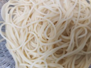 ペスカトーレソースを作ったら次は保存しておいたスパゲティを混ぜていきます。