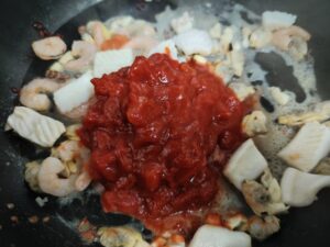 ちなみになぜ海鮮を先に炒めてほしいのかといいますとニンニクから先に炒めると焦げてしまうので先に海鮮を炒めつつある程度柔らかくなったらニンニクと鷹の爪を加えていきます。