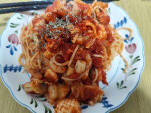 今回は辛味とうまみが利いたペスカトーレスパゲティを作りました。