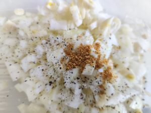 みじん切りに切ったら今度はコンソメと塩、コショウを振りかけて電子レンジで温めてもいい容器に入れてください。