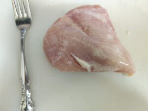 お話は変わりますがこの後作る準備ができたら鶏むね肉を用意してフォークで刺しましょう。