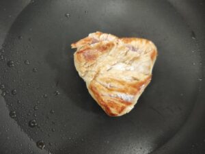 ちなみに写真では鶏むね肉をそのままにして焼いていますがブロック状にして切るとさらに焼きやすくなり短い時間で済むので簡単にパサつきを防ぐこともできますので不安な方はブロック状にして切るのもいいかもです。
