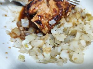 正直な話鶏むね肉は少し硬くなってしまいましたが味付けのソースと玉ねぎがカバーしていて追加で付けたショウガチューブがさらにうまみを引き立てておいしかったです。