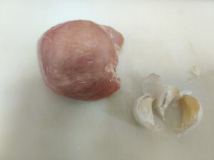 まずは鶏むね肉とニンニクを切りましょう。