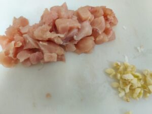 ニンニクと鶏むね肉を切るときは細かく切ってください。