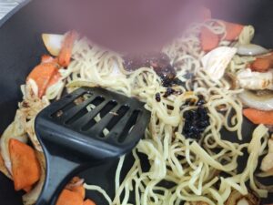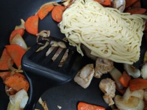 先ほどの材料を焼いたら次は焼きそばの麺とソースを入れていきましょう。