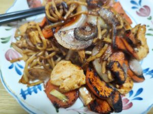 はい、ソースが鶏むね肉、焼きそばの麺、野菜全体に絡み合っていて隙が全然ありません。